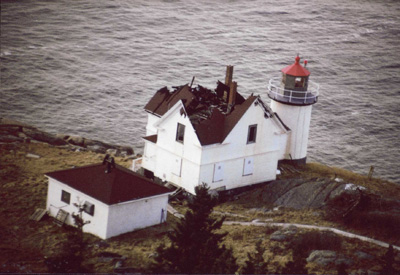 Aerial photo showing the damage caused by the fire in April 1989. Notice that much of the roof of the keeper’s house was burned away, leaving the rest of the stricture open to the elements. (Lighthouse Digest archives photo by Timothy Harrison.)
