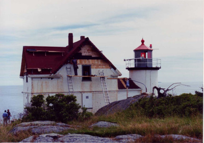 A new roof on the Heron Neck lighthouse keeper’s house has been installed to replace the one destroyed in a fire and the new under-siding is shown being installed. Prior to this, most of the roof had been destroyed and the keeper’s house remained open and exposed to the elements for three years while Coast Guard officials created numerous delays in allowing the house to be restored with private funds. This caused a national uproar that was covered by the national TV news. The resulting chain of events changed the course of the preservation of lighthouses for the entire nation. (Lighthouse Digest archives photo taken by Timothy Harrison in August 1994.)