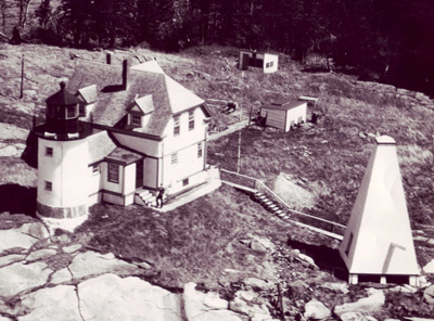 This photograph of Heron Neck Lighthouse was dated 1937. The keeper standing on the steps of the keeper’s house is Andrew W. Bennett, the last keeper of the United States Lighthouse Service to have served here. Interestingly, the fog bell is not hanging from the fog bell tower and may have been moved to a pier. The fog signal building, sometimes referred to as the whistle house, had not yet been built when this photo was taken. The station’s log books indicate the fog signal building, also known as the whistle house, was constructed in 1948 and it was officially reported in operation in 1949. Also shown here are a couple of out-buildings that no longer stand. (Lighthouse Digest archives.)