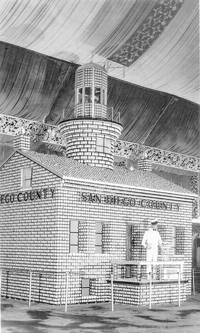 San Diego, California’s entry into the 1935 National Orange Show was a 2/3 scale replica of the Old Point Loma Lighthouse, that was more commonly known then as the Old Spanish Lighthouse. The man in charge of the exhibit, M. E. Salsberry, told the Los Angeles Times that the structure was made of 25,000 Navel Oranges, in addition to a profusion of lemons and grapefruits. The mannequin lighthouse keeper actually looks more like a milkman of that era in his all-white uniform with a bow tie.