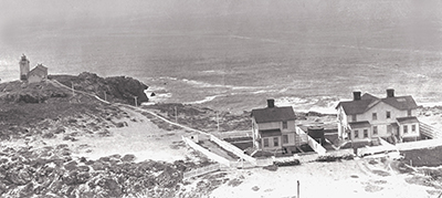 During Walter White’s time from 1916 to 1920, the Point Arguello Lighthouse reservation had a detached tower next to the fog signal building, a head keeper’s single dwelling, and a duplex shared by two assistants, Walter and 1st assistant Arthur A. Newhall. This photo was likely taken from climbing the Navy radio tower close-by. (Courtesy of Betty Westby) Back to the edition of: May/Jun 2022