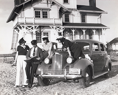 The Point Hueneme Lighthouse is sitting up on blocks, awaiting its move across the channel in this 1940 photo, while Walter White reads out of the logbook to Lorraine Liddle (l), Lavonne Sinkie (center) and Jerry Chapman (r). (Courtesy of Betty Westby) Back to the edition of: May/Jun 2022