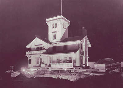 On the night of February 15, 1940, floodlights illuminate the scene as the old Point Hueneme Lighthouse was being loaded onto a barge to transport it across the channel to its new location to serve as the Port Hueneme Yacht Club. Notice the removal of the lantern top and lens. (Courtesy of Betty Westby) Back to the edition of: May/Jun 2022
