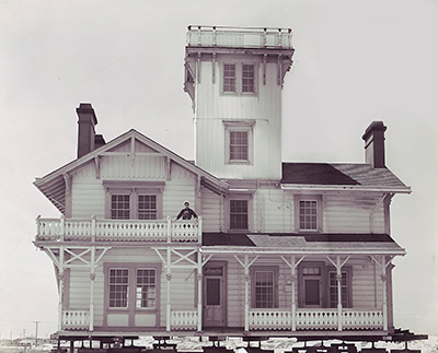 Keeper White stands on the balcony of the Point Hueneme Lighthouse, which sits on blocks awaiting its move in February of 1940. Sadly, two years later, the lighthouse was demolished to make way for a Naval base to be set up during World War II. (Courtesy of Betty Westby) Back to the edition of: May/Jun 2022