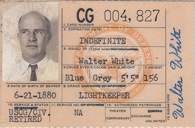 Shown is Walter White’s retirement-era Coast Guard identification card which classifies him as a former civilian lighthouse keeper. Walter commented in a local newspaper article about the consolidation of the U.S. Lighthouse Service with the Coast Guard, which he felt was a mistake: “A lighthouse was home to the man in the Lighthouse Service. He had his family with him, and could raise a garden. But the Coast Guard men are ‘here today and gone tomorrow.’” (Courtesy of Betty Westby)