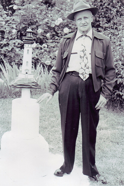 For a Vashon Island newspaper interview, Walter White, then age 80, stands next to the model of Piedras Blancas Lighthouse that his son, LeRoy, had constructed while living at Point Hueneme. The lighthouse is resting on a stand for a rain gauge that Walter had built several years before. The article reported that “White nevertheless is not interested either in boating or water now. ‘I’ve had enough of it,’ he will tell you.” (Courtesy of Betty Westby) Back to the edition of: May/Jun 2022