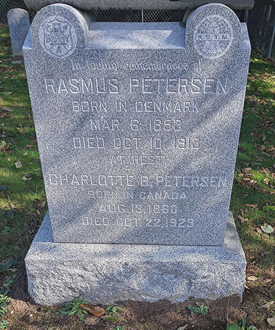 Rasmus and Charlotte Petersen rest together in North Cove Pioneer Cemetery in Washington. The round shield emblems at the top corners of the gravestone represent Rasmus’ membership in the Brotherhood of American Yeoman and the Knights of the Maccabees. Both organizations still exist today in the form of life insurance companies. (Photo by Elaine and Bill Schrock) Back to the edition of: May/Jun 2023
