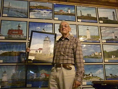Ernie DeRaps and his lighthouse paintings. He is holding his painting of Maine’s Monhegan Island Lighthouse where he lived with his family as a lighthouse keeper from 1956-1957. (Lighthouse Digest archives) Back to the edition of: Sep/Oct 2023