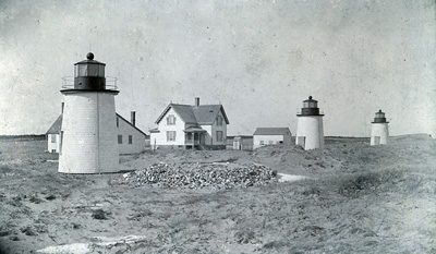 Nauset “Three Sisters” Lights c.1892-95, showing the three 1892 towers before storm porches were added. Back to the edition of: Mar/Apr 2013