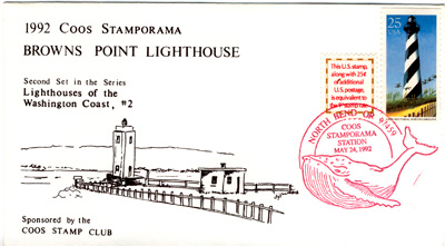 This cached envelope that features Browns Point Lighthouse was issued by the Coos Stamp Club in May of 1992 with the Cape Hatteras Lighthouse postage stamp. It was the second is a series of Lighthouses of the Washington Coast to be issued by the club for the 1992 Coos Stamporama. Cached envelopes like this are popular among ephemera collectors and make for great display items at lighthouse museums. (Lighthouse Digest archives.)