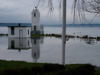 The area between the Browns Point Lighthouse and keeper’s house was called a lagoon by keeper Oscar Brown. Often times, he had to row to the lighthouse. After being filled multiple times, the area still floods after heavy rains as is shown in this recent photo, but nowadays the water dissipates after a few days. Back to the edition of: Mar/Apr 2013