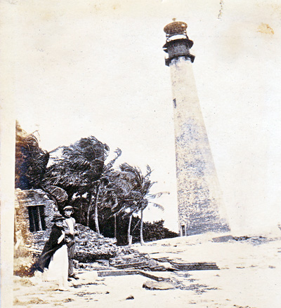 A well-dressed couple took a moment to pose in front of the ruins of the Cape Florida Lighthouse. Erosion and storms had claimed the keeper’s house and erosion was threatening the tower. (Lighthouse Digest archives.)