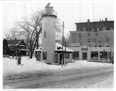 The Tower Gas Station in Watertown, New York. Old newspaper advertisements gave the address for the Marcy Buck store, shown in the background, as 102 Mill Street in Watertown. (Courtesy Susanne Greenhagen, co-historian Eaton, NY.) Back to the edition of: May/Jun 2012