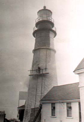 Keeper Strout white-washing the tower at Portland Head Light.
