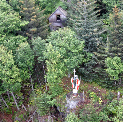 This 1998 aerial view of the Point Sherman Lighthouse Station shows that nature has reclaimed the property. At the top of the photo you can see the ruins of the former keeper’s house where families once lived in the service of others. Toward the bottom right of the photo you will see a day mark with a beacon on top of it that sits on the round stone foundation where the lighthouse once stood. This now serves as the aid to navigation. (Photo courtesy Bob and Sandra Shanklin, The Lighthouse People.)