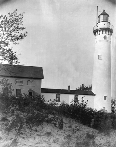If you look closely at this vintage image of South Manitou Island Lighthouse, you will notice the date of 1858 above the door on the house. Before the tall tower was built, the tower and lantern protruded from the roof of the house. (Lighthouse Digest archives.) Back to the edition of: Mar/Apr 2015