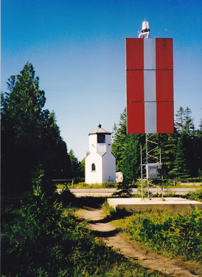 The red and white metal direction marker, shown here in front of the Baileys Harbor Range Front Lighthouse, has been removed from the site now that the non-typical looking lighthouse has been relighted. Back to the edition of: Nov/Dec 2015