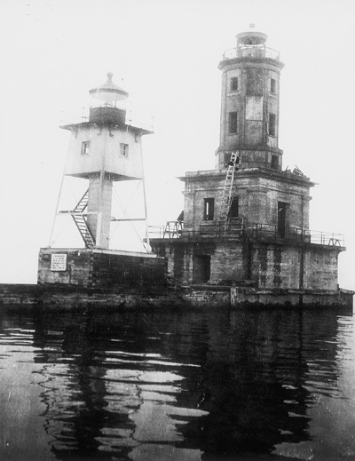 The 1920 Portage Lake Lower Entrance Light (r) upon completion. Shortly after this the old tower on the left was torn down. Photograph courtesy of the National Archives. Back to the edition of: March 2001