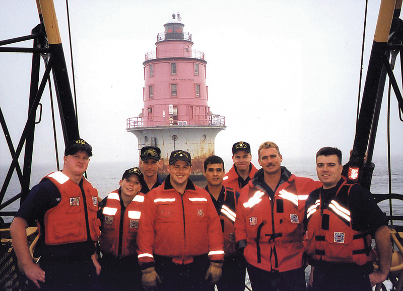 Members of the ANT Cape May on the stern of a 49-foot buoy boat at Miah Maull Shoal Lighthouse. Bob Trapani is at the far right, with Senior Chief Dennis Dever next to him. Back to the edition of: June 2001
