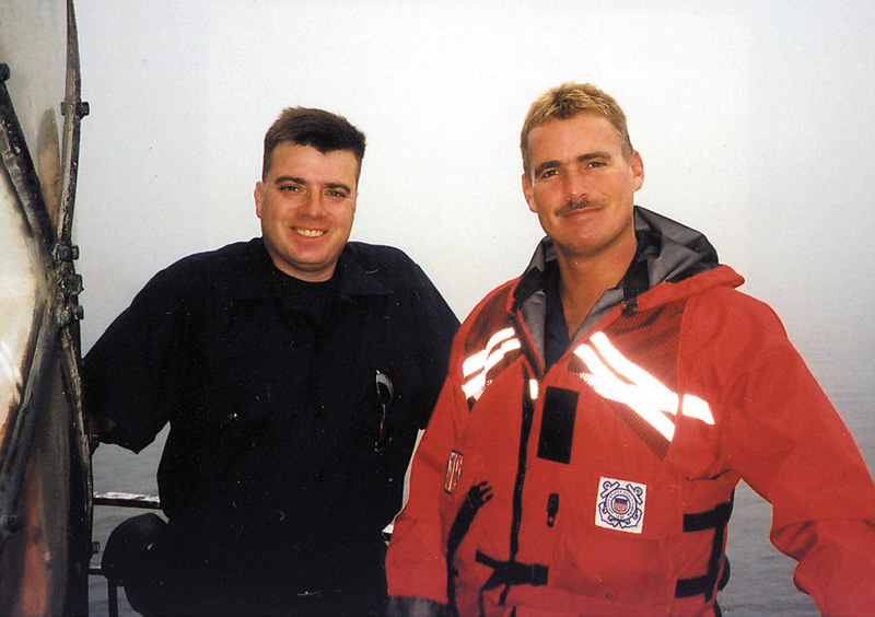 Bob Trapani and Senior Chief Dennis Dever outside the lantern room at Miah Maull Shoal Lighthouse in the Delaware Bay, New Jersey. Back to the edition of: June 2001