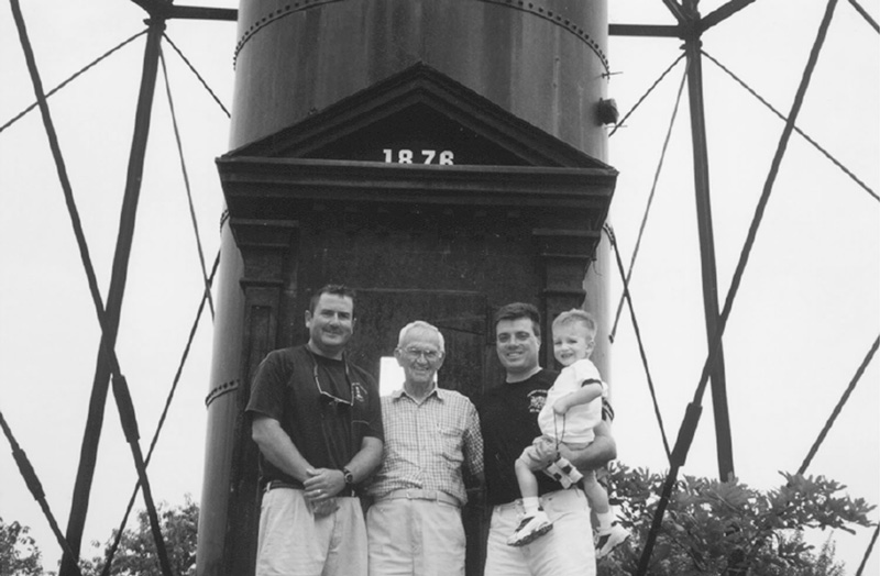 Chief Michael Baroco of USCG Aids to Navigation Team Philadelphia, Harry Spencer, Jr., and Bob Trapani with son Dominic in front of the Liston Range Rear Light’s vestibule. Back to the edition of: December 2001