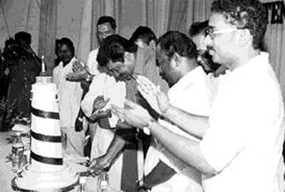 Bharat Sri. Suresh Gopi, a famous film actor of South India is shown here cutting the lighthouse cake at the Tangassery Lighthouse Centenary. Clapping his hands is Dr. B. Ashok who is the Secretary of the District Tourism Promotion Council of Kollam. Back to the edition of: June 2002