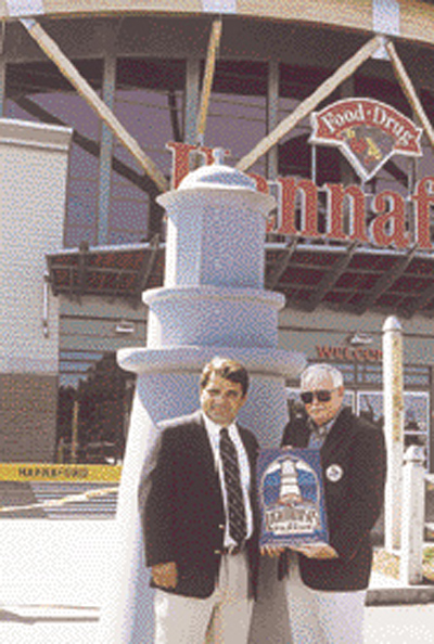 Fred Forsley (l) of Shipyard Brewing Co and Tim Harrison of The American Lighthouse Foundation pose in front of one of the lighthouse models with the Lighthouses on Parade logo. Shipyard Brewing, which makes Shipyard Light Ale that features six different lighthouses on its labels, is a corporate sponsor of the American Lighthouse Foundation. Shipyard Brewing also owns Federal Jacks, a popular restaurant in Kennebunkport, Maine, which is sponsoring one of the lighthouses, which will be displayed at the restaurant. Harrison is also editor of Lighthouse Digest and a partner in Lighthouse Depot, which will also display one of the lighthouses in front of its store in Wells, Maine.