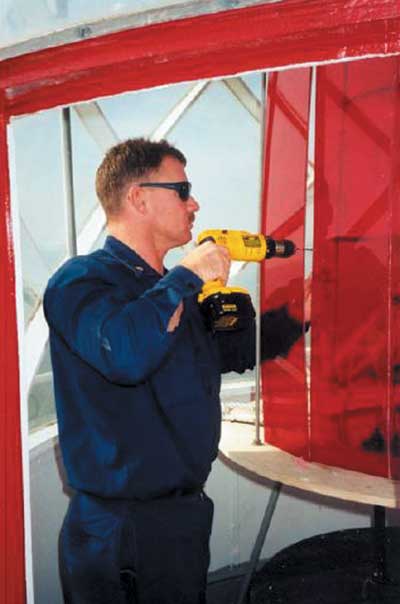 Senior Chief Dever realigns a red Lexan panel that helps form the red sector in the lantern room of Brandywine Shoal Lighthouse. Back to the edition of: January 2003