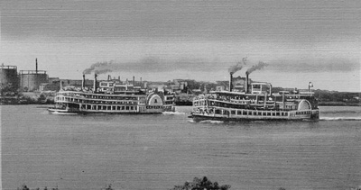 A steamboat race on the Ohio River, Louisville KY, from an old postcard. Back to the edition of: February 2003