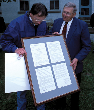 Presentation of the land patent to Capt. Burkhard for the Lighthouse Society to hang in the lighthouse museum. Back to the edition of: August 2003
