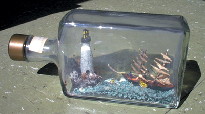 Inside this bottle is the rescue scene at Wood Island where not only the ship Edyth Ann is created in intricate painstaking detail by artist Iona Desmond, we also see Eben Emerson and the lit tower. Back to the edition of: May 2004