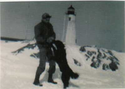 Melvin Brooks with the lighthouse dog, Richard, in the winter of 1958 at Baker’s Island Lighthouse, Salem, Massachusetts.