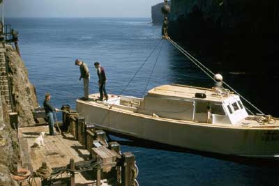 The Anacapa station boat suspended at the dock, ready to be lifted to its cradle. From left, Dave Hickey, Don Simpson, Jerry Dauster, with Taffy giving her opinion. Back to the edition of: July 2005