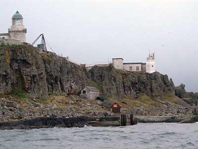 Here you can see both the 1793 lighthouse at Little Cumbrae and its 1997 replacement to the right. Also visible is the boathouse, down close to the water. John Hill remembers, “We had several hairy launches in bad conditions. But sometimes the boat would be launched early if bad weather was expected, and it would be moored on the south side of the island. Sadly for us, we did not miss school that often. The boat itself was a wooden craft with a large diesel engine. I always felt safe in it despite its size, about 17 feet. It felt almost unsinkable as it had a lot of buoyancy, or maybe it was just Dad’s reassurance that it was unsinkable, but either way, it worked for us and we were never scared. On a good day we could reach Millport in about 20 minutes, but in bad weather it could take twice that long, as we would roll with the waves, bobbing up and down like a cork. Like most wooden boats it leaked, and the water