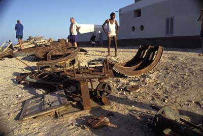 When the lighthouse was electrified in 1995, the old gas lamps and Fresnel lens were no longer needed. The remains were left strewn on the ground at the base of the lighthouse. This photo was taken in 1999. Back to the edition of: October 2005