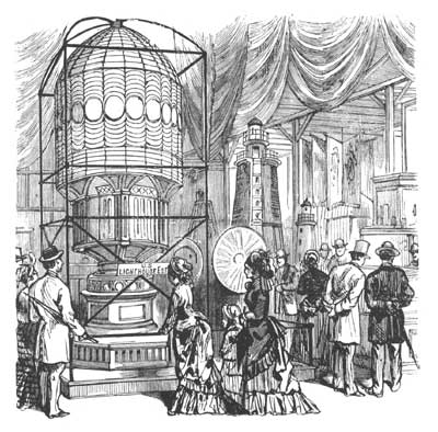 Visitors inspect a first order Fresnel lens, models, lamps and reflectors inside the U.S. Government Building. Illustration: Frank Leslie's Historical Register, from the author's collection. Back to the edition of: May 2006
