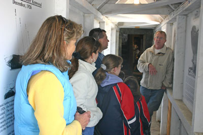 Exhibits in the covered walkway between Scituate Lighthouse and the keeper’s house tell stories of local history, including the Army of Two. Here, David Ball of the Scituate Historical Society speaks to a group of visitors in the walkway. Back to the edition of: September 2006