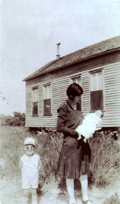 Emma Ryan, wife of lighthouse keeper Toney Ryan by the keeper's house at Sabine Pass Lighthouse in Texas in 1930. Emma is holding daughter Doris while son Larry is standing next to them. Photograph courtesy of Sandra Brickwedde. Back to the edition of: July 2007