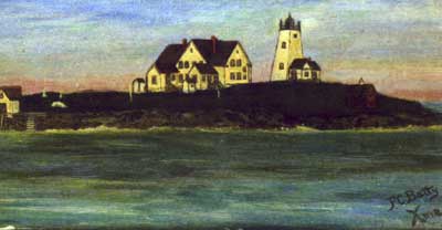 Painting of Two Bush Island Lighthouse by lighthouse keeper Fred Batty that was given to fellow lighthouse keeper Leland Mann when the two of them were stationed at Two Bush Island Lighthouse in 1931. In 1971 this painting was donated by Darrell Mann to the Seacoast Mission and is now part of their Historic Paintings Collection. In 2002 they used this image for their yearly Christmas card. Photograph courtesy Diana Trombly.