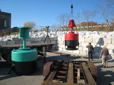 The restored buoys were trucked to their temporary location. Eventually they will be installed on the grounds at the Fort Gratiot Lighthouse. Back to the edition of: April 2009