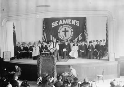 This large oversized plaque in memory of the Titanic disaster as it was being dedicated at ceremonies at the Seamen's Institute in New York City, before it was placed on the lighthouse at the top of the building. Back to the edition of: April 2009