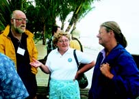 (l-r) Phil Germain of the Friends of Seguin Island,(Maine); Cheryl Parker of Portland Head Light,(Maine); and Anne Webster Wallace of The Maine Lights Program braved the hurricane weather at the National Lighthouse Conference held in Key West, Florida Back to the edition of: December 1999