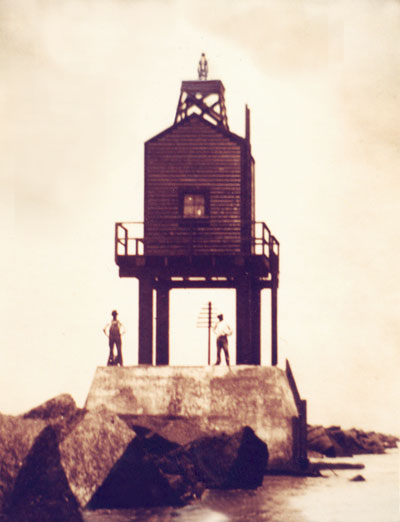 The 1897 temporary jetty light. This was on top of a single-room building on stilts, with a red light occulting every 2 seconds, with a focal plane of about 35 feet. Keepers from the Bolivar Lighthouse serviced this light. By the early 1900s it was replaced by a daybeacon with a red square on a pyramidal slatted structure on piles atop a concrete block.