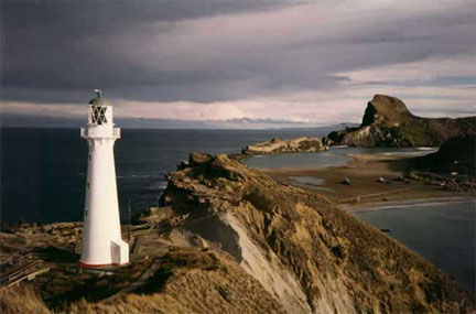Notes: This cast-iron sectional tower was manufactured in New Zealand by Luke's Foundry in Wellington City, the same company that made the one at Cape Palliser. The lighting equipment came from Scotland, and the second-order Fresnel Lens was made in France. (Thanks to P. W. Shirley.) The station is said to be haunted by the ghost of a keeper who fell to his death. Tower Height: 75 Height of Focal Plane: 171 Characteristic and Range: Three white flashes every 30 seconds, visible for 26 nautical miles. Description of Tower: White, conical cast iron tower.