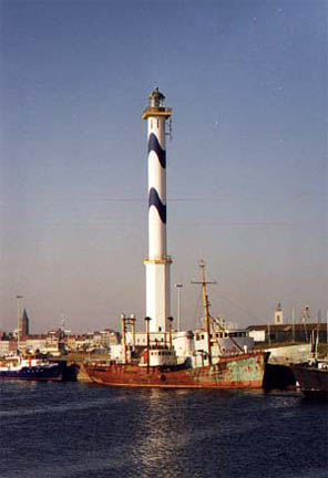 Notes: Light beacons of one kind or another have been recorded at Ostend since at least 1366. The 1860 tower was severely damaged during World War I, and the old 1771 tower was then put back in service for a few years. In 1921, the light was moved to a framework tower, then in 1925 to a new lighthouse, which was itself destroyed in 1940. The present lighthouse was built after World War II and became operational in 1949. It's had its current color scheme since 1998. Tower Height: 190 Height of Focal Plane: 213 Characteristic and Range: 3 white flashes every 10 seconds, range 27 nautical miles. Description of Tower: Conical white tower with octagonal lower portion, blue stripes on upper portion.