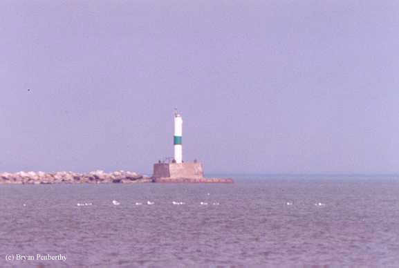 Notes: This light tower is at the end of a long rough stone breakwater. Height of Focal Plane: 30 Characteristic and Range: White light occulting every 4 seconds. Description of Tower: White cylindrical tower with central green horizontal band.