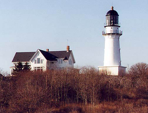 Other Buildings? 1878 wood Victorian two story keeper's house (severely remodeled and enlarged in 1999), 1886 brick fog signal building. Earlier Towers? 1828: First pair of Cape Elizabeth lighthouses -- two 65-foot rubblestone towers. Date Established: 1828 Date Present Tower Built: 1874 Date Automated: 1963 Optics: 1855: Second order Fresnel lens; 1994: FA-251. The 1855 Fresnel lens once on display at Cape Elizabeth Town Hall, is now at the Maine Maritime Museum in Bath, Maine. Fog Signal: 1830s: Fog bell; 1869: Steam fog whistle. Now automated horn with two blasts every 60 seconds. Current Use: Active aid to navigation, private residence. Open To Public? No. Directions: From US 1, take ME 207 southeast to ME 77. Follow ME 77 (Spurwink and Bowery Beach Roads) northeast for about 5.5 miles to a triangular intersection marked with a "Two Lights State Park" sign. Turn right into Two Lights Road. About 1.4 miles from the intersection, turn left off Ocean House Road at Two Lights Terrace. The lighthouse is at the end of the terrace. There is no public parking on the terrace and the property is privately owned. The restored west tower can be seen on your right on Two Lights Terrace as you leave. For a good but more distant view, continue straight on Ocean House Road to a free parking area. The lighthouse can be seen from here, and there is a jetty beyond the parking area. Walk out on the jetty for good photos, especially if you have a telephoto lens. Mapquest URL: Click here to get a map to this lighthouse! Listed on the